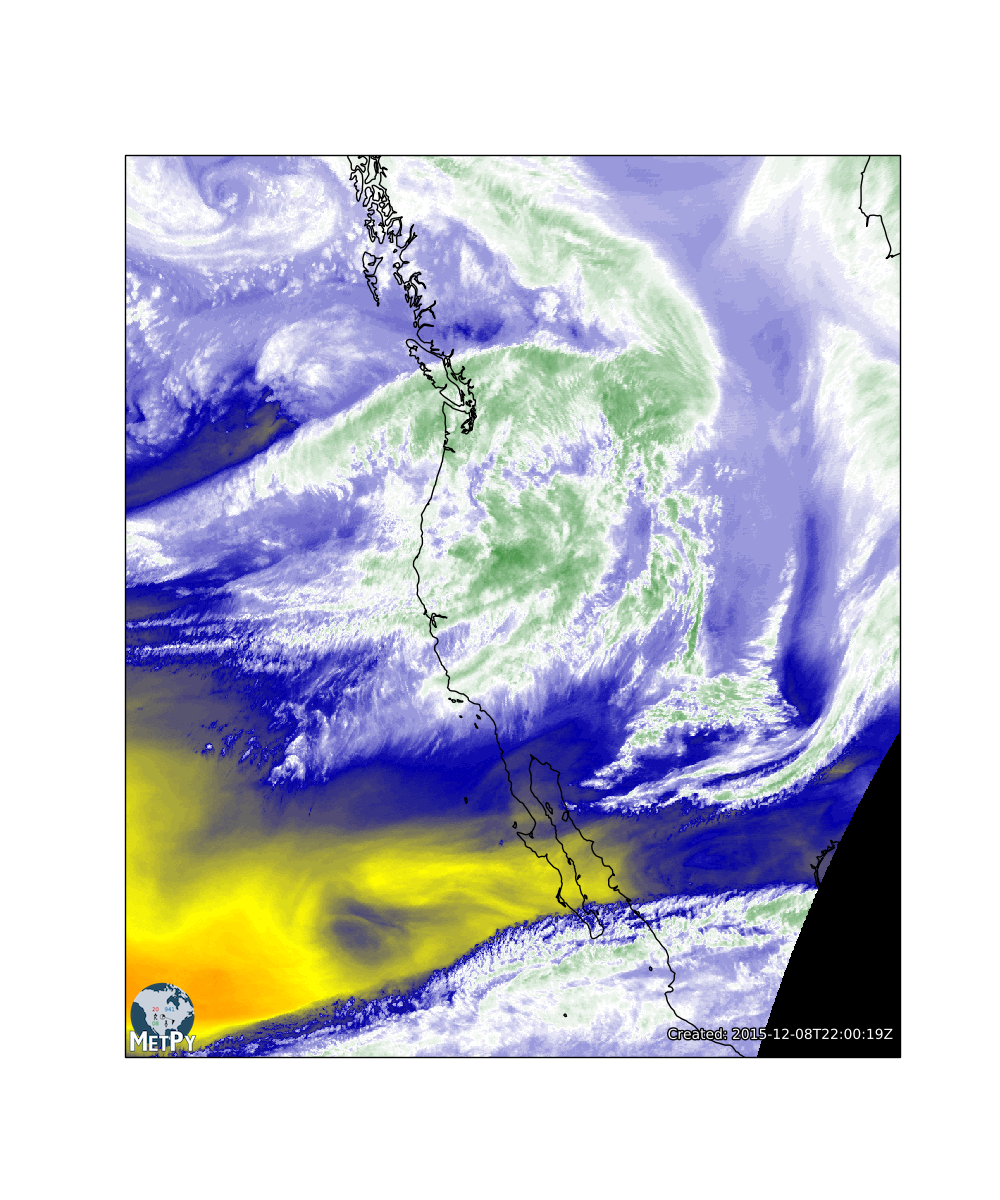 Use MetPy’s support for GINI files to read in a water vapor satellite image and plot the data using CartoPy.