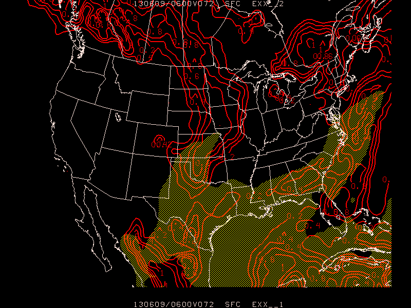 The GFS model provides deterministic output at the 72 hour forecast time for 6 hour accumulated precipitation (P06M) and boundary layer CAPE as shown in GDPLOT2 using: