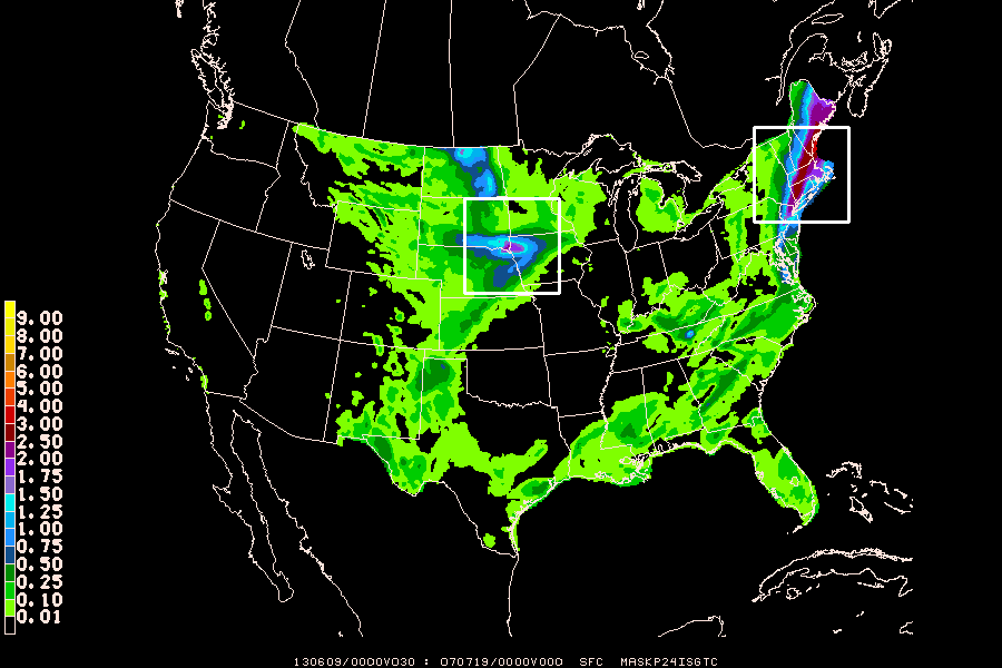The locations of the 2 greatest local maximas (42.3889,-72.2385 and 42.9560,-96.3721) are shown along with the precipitation forecast field. The primary and secondary domains can be drawn using GPANOT to overlay the boxes.