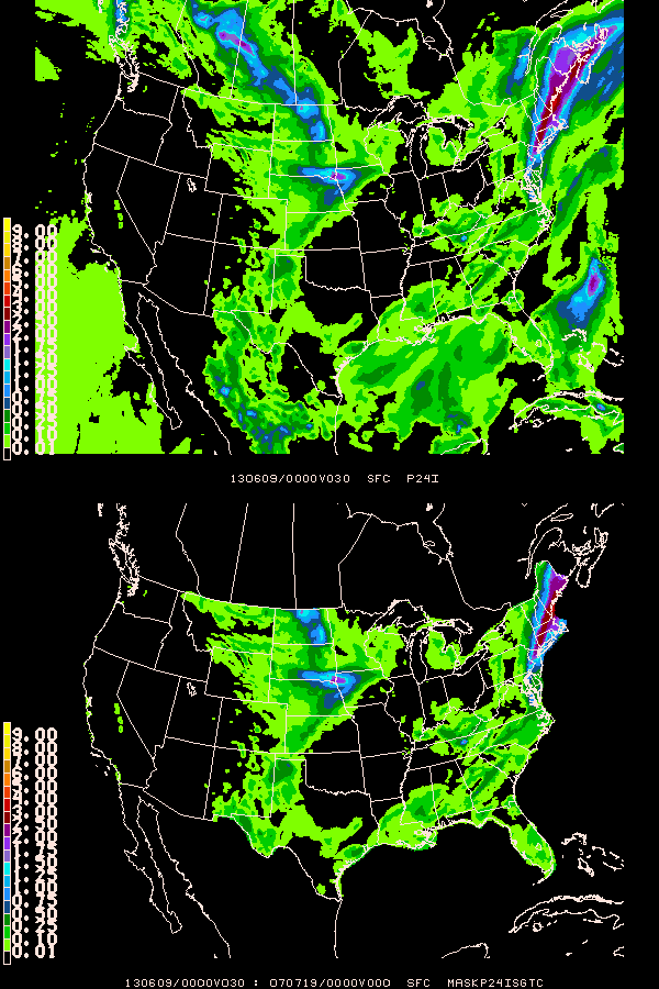 The resultant grid can ge used with the MASK() function and logical operators to define mask or clipping regions of interest. As an example, the 24 hour precipitation in the top panel is masked by the region of interest in the lower panel so that only data within the region of interest will be considered.
