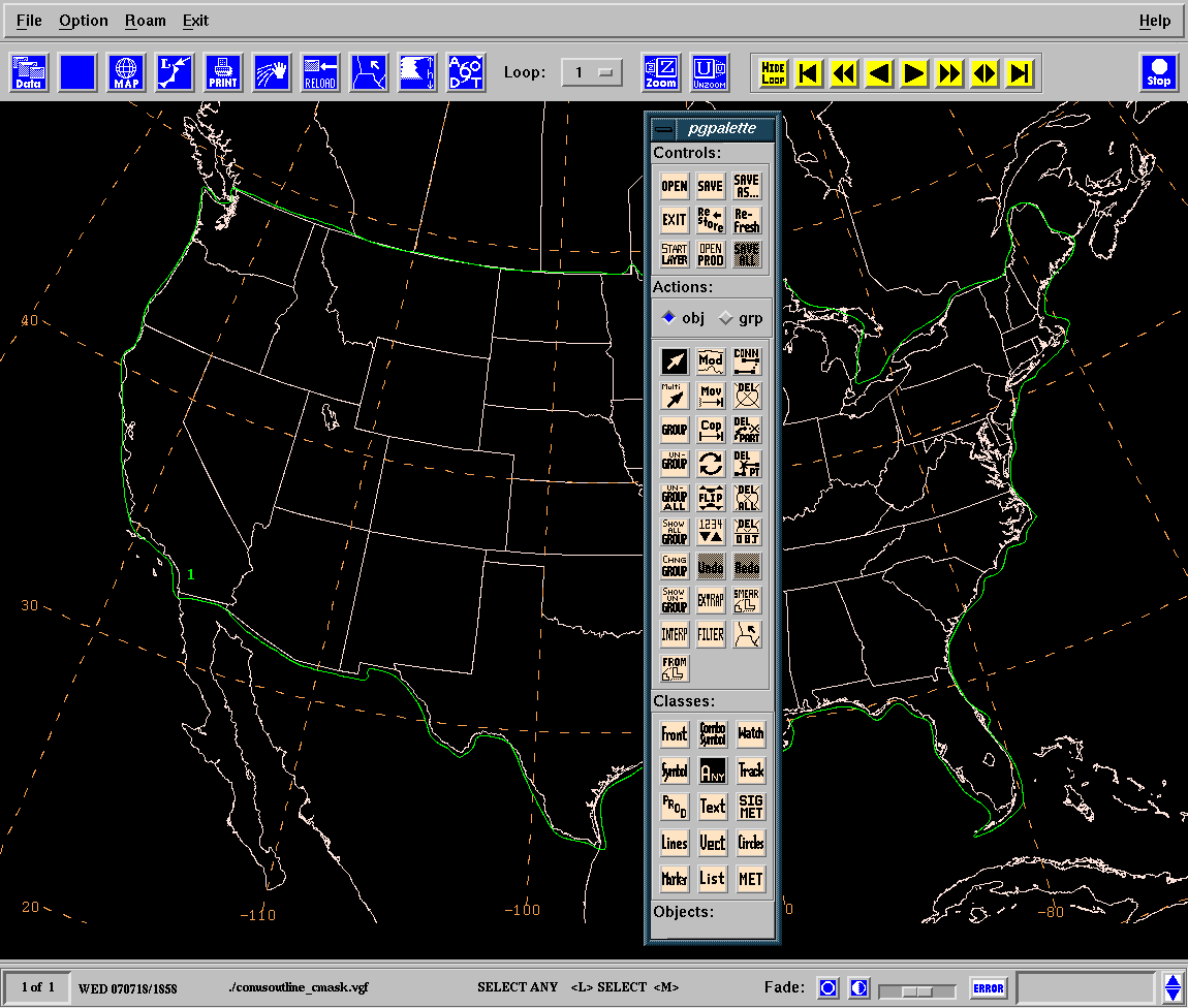 A vgf file is created using the interactive product generation tools within NMAP2. A closed line is drawn enclosing the region of interest, and a text label is grouped with the line assigning a value of 1 to the contour.